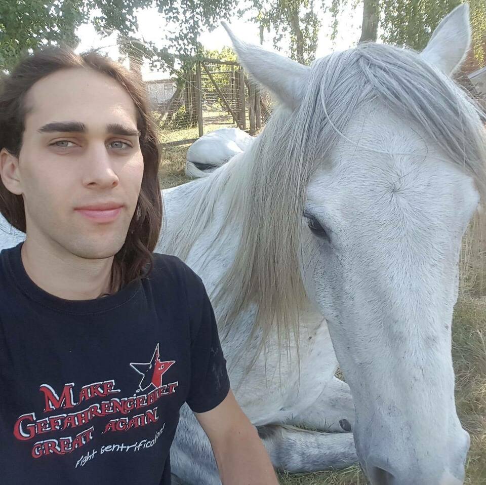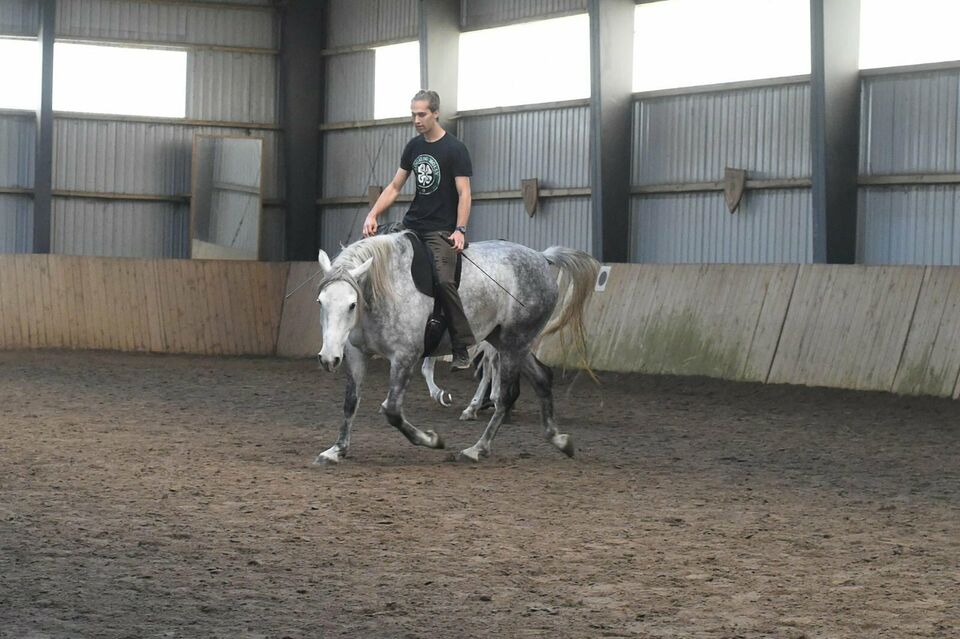 Gideon's Seelenpferd Klopsi (den er am 01.06.2013 bekommen hat) und Gideon auf einem Kurs von Honza Blàha im Jahr 2016 bei der Arbeit einer Dehnungshaltung auf dem Zirkel.